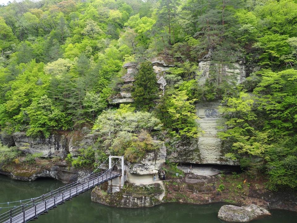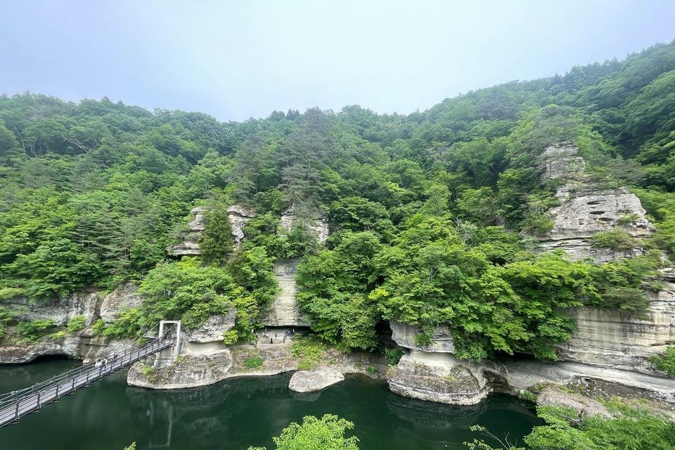 橋の真ん中にたどり着いたら、ぜひ一度足を止めて周囲を見渡してみてください。神秘的なエメラルドグリーンの川面と、力強くそびえ立つ岩肌が織りなす、自然のコントラストが訪れる人を魅了します。季節ごとに表情を変えるのも魅力で、特に春のシーズンには藤の花や鮮やかな新緑が景色に彩りを添えます。