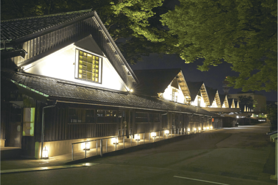 山居橋は山居倉庫と市内を結ぶために造られ、庄内の歴史の中で重要な役割を果たしていました。現在は周辺の古い街並みの整備と合わせて、昔のイメージで復元されたものです。山居倉庫などの景観に配慮し外観はすべてヒバ材が使われ、灯風の照明灯和風の木橋が表現されています。