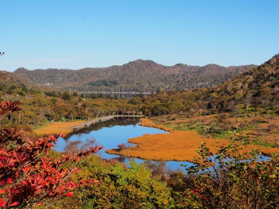 標高1360mに位置し、周囲約1kmほどの覚満淵は大沼の一部が湿原化したもので、ミズバショウや希少な湿生植物と高山植物の宝庫であるため「小さな尾瀬」とも言われています。6月中旬~下旬頃にはレンゲツツジ、初夏には新緑、秋には紅葉、冬は雪景色など、四季折々の自然が楽しめます。