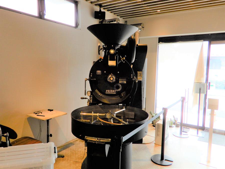 お店に入るとすぐ、大きな焙煎機があります。1960年代にドイツで作られたビンテージもので、世界中から高く評価をされているそうです。焙煎機の釜に使用されている鉄鋳物は、重さ1tもあり存在感があります。