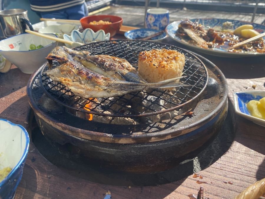 干物づくりのあとは、炭火で焼いたホスト特製の干物と焼きおにぎりを召し上がれ!
