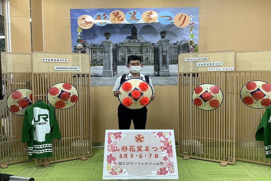 盛り上がりを見せる中、駅たびコンシェルジュ山形では山形花笠まつりパレードのゴールゲートをイメージした手作りのフォトスポットを設置!実際にパレードで使うハッピや花笠を持って写真撮影。山形県内外のお客さまや訪日のお客さままで、たくさんのお客さまに喜んでいただくことができました。