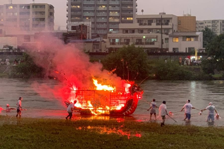 会場は日本最大級の河川である北上川の明治橋辺りで、提灯や盆の供物で飾った舟に火を放ち、川に流し、祖先の霊を送り、無病息災を祈る送り盆の行事です。