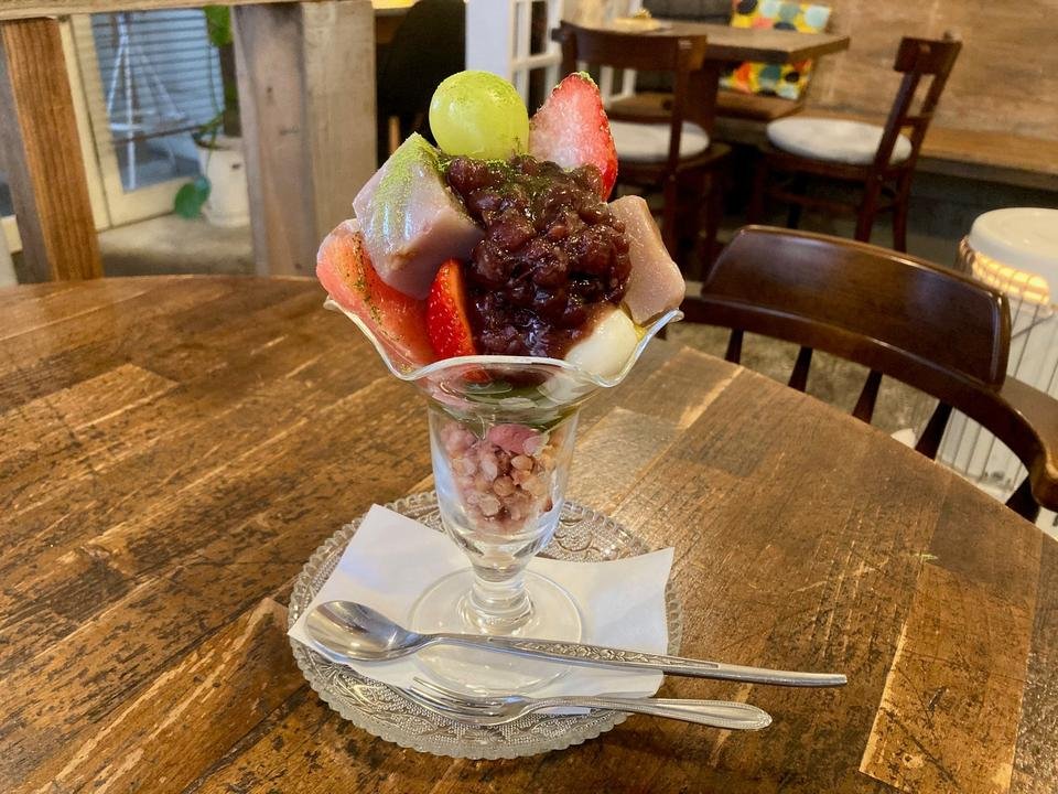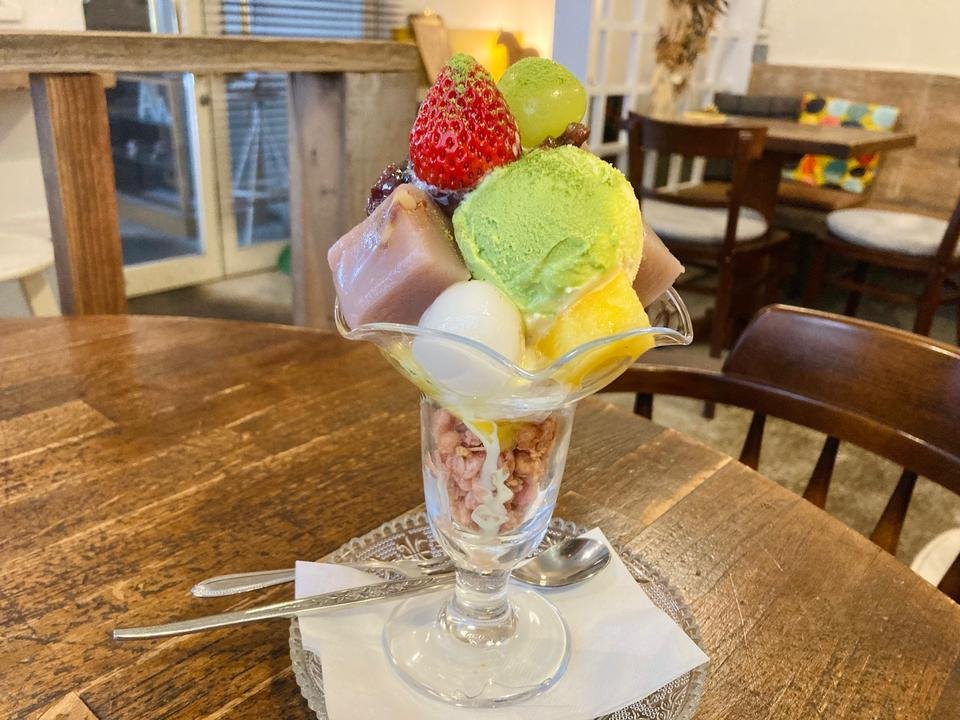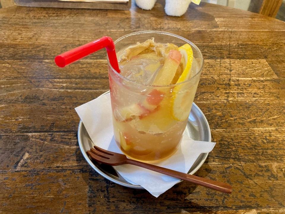 デザートやドリンクも気になり、追加で「久慈良餅(くじらもち)宇治抹茶白玉あんみつパフェ」と「自家製アップルジンジャエール(アイス)」をオーダー。