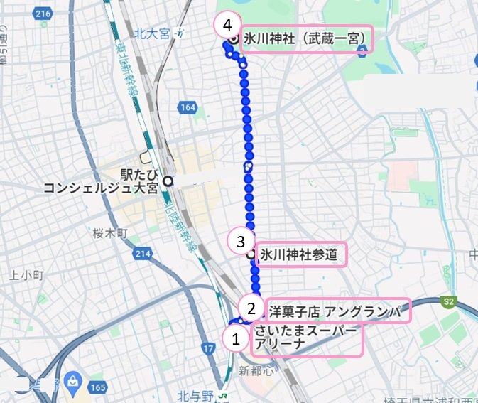 "たまアリ"から徒歩約10分で、武蔵一宮 氷川神社へ抜ける氷川参道があります。