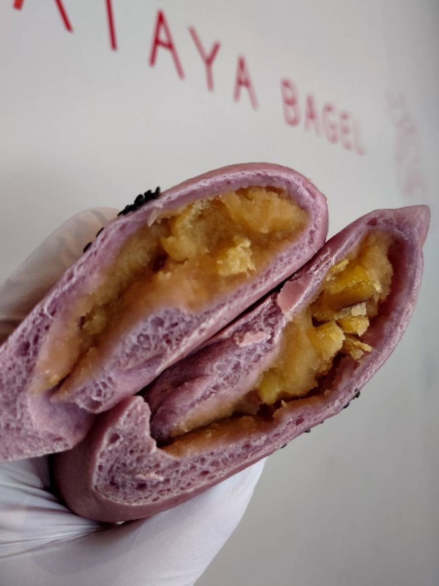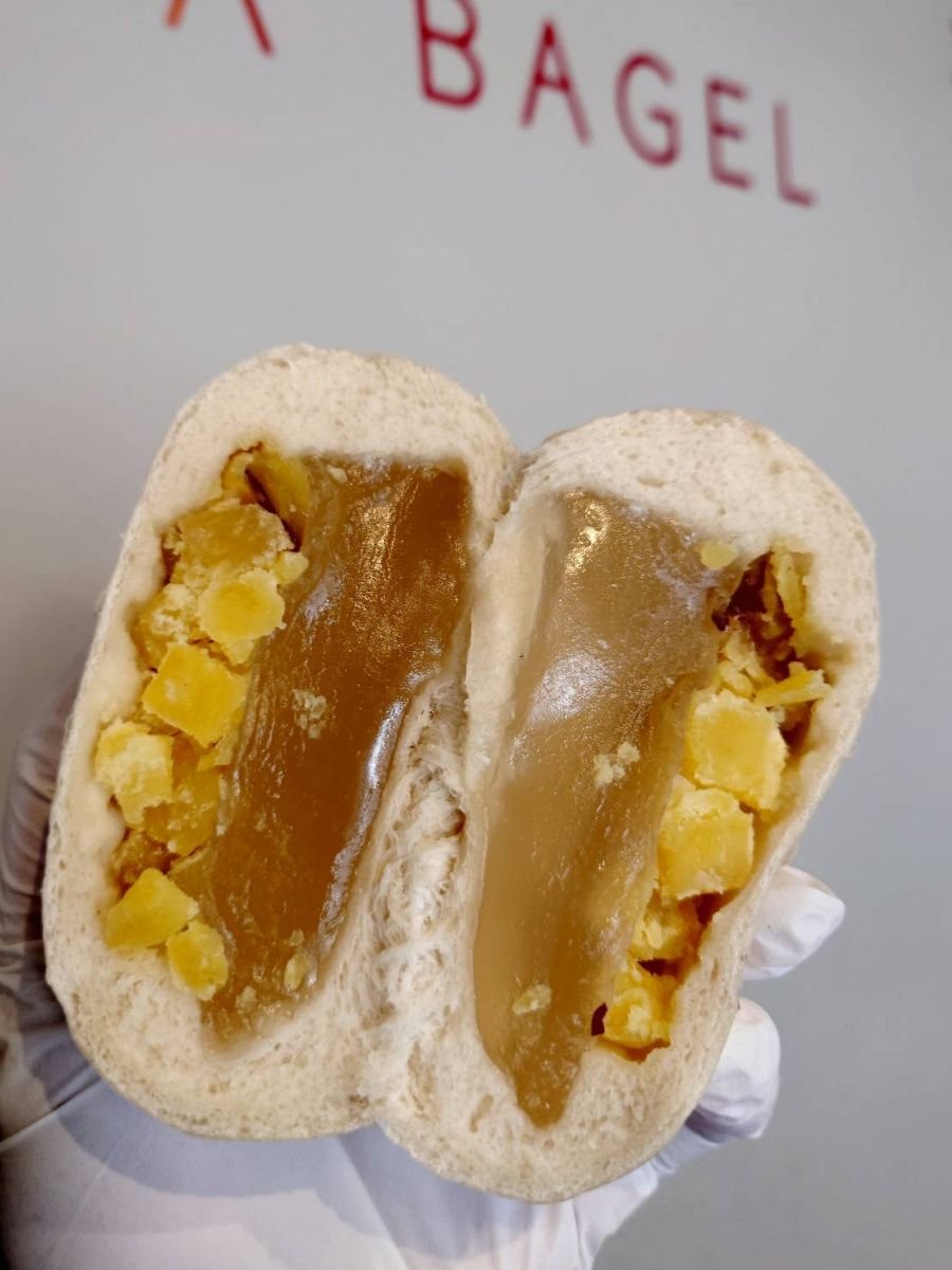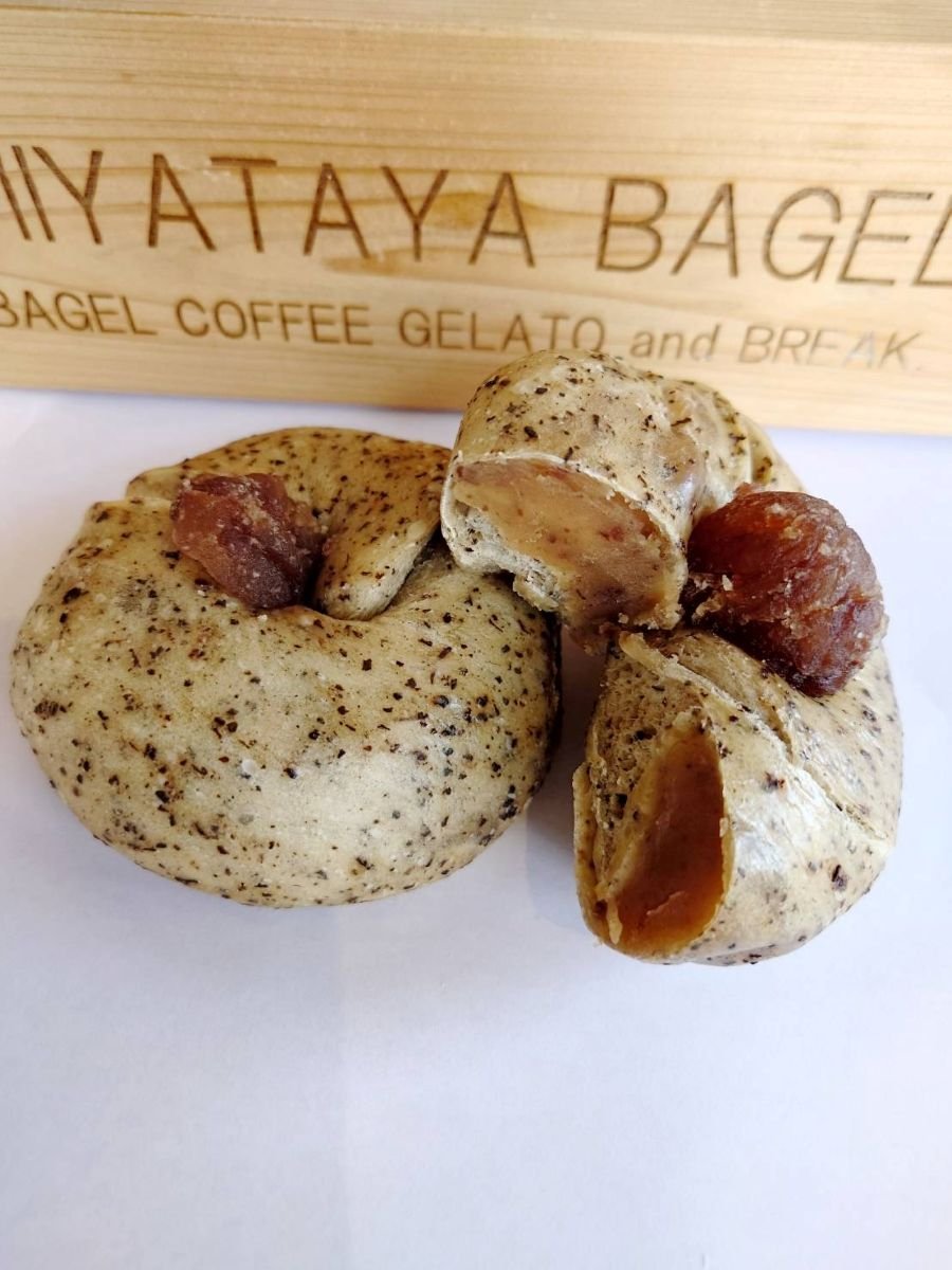 おすすめ商品1つ目は季節のわらび餅ベーグル~おいも~。さいたま市推奨土産品にも認定されている自家製わらび餅を包み込んだベーグルで、秋といったらさつまいも!なると金時も一緒にお召し上がり頂ける大人気おやつベーグルです。