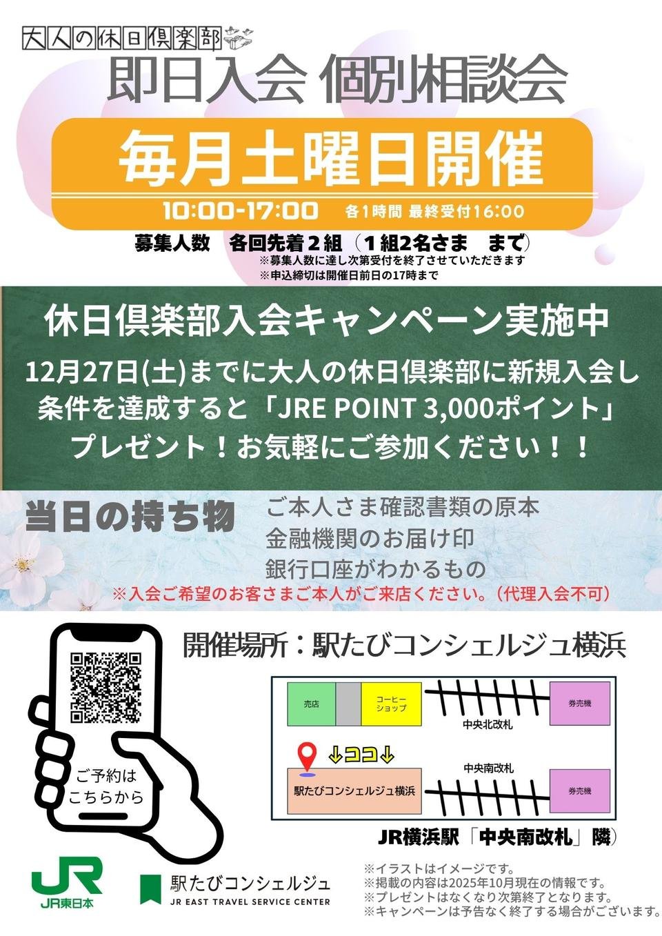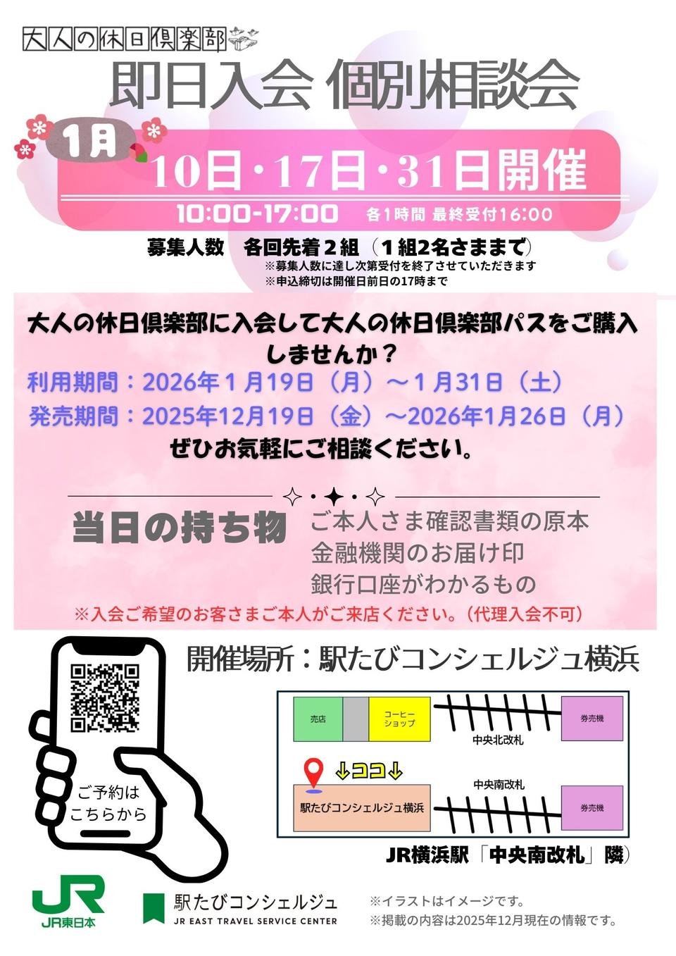大人の休日俱楽部詳細は、スタッフへお問い合わせいただくか、もしくはチラシをご覧下さい。駅たびコンシェルジュは来店予約制です。ご来店の際は下記バナーよりご予約お待ちしております。