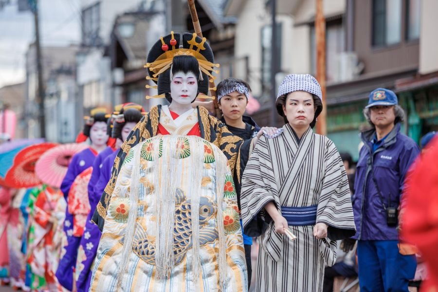 県内外の応募者の中から選ばれた「信濃」「桜」「分水」の3名の「おいらん役」が絢爛豪華な衣裳に身を包み、高さ15cmもの三枚歯黒塗りの高下駄を履き、独特の外八文字の歩き方を披露。また、道中では「手古舞」「新造」「かむろ」「舞妓」など50名を超える付き人が、主役の「おいらん役」をより華やかに引き立てます。