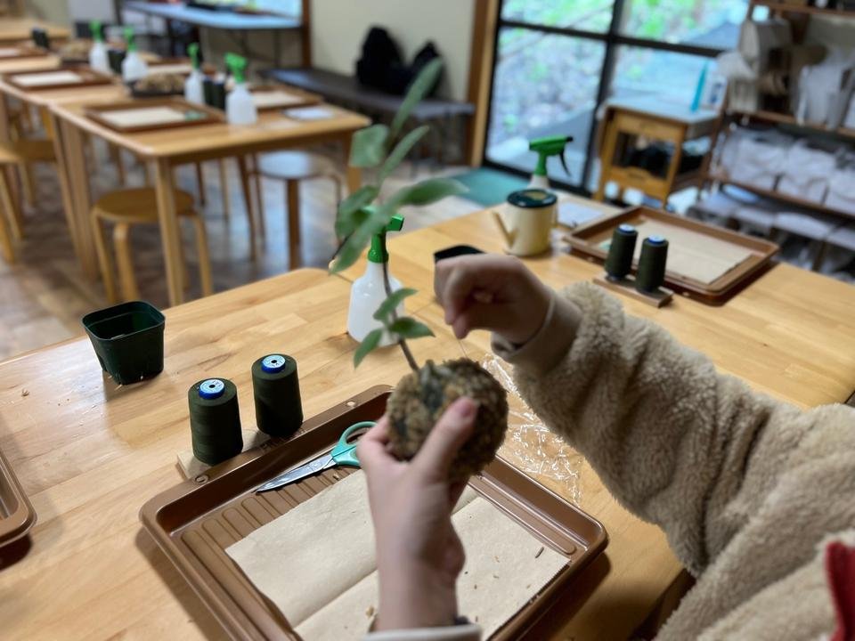 丸めた後は、こけ玉のベースが崩れないよう糸でくるくると巻いていきます。全ての作業にコツがあり、先生が優しく教えてくれます。少しずつ完成が見えてきましたよ♪