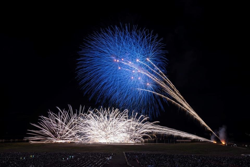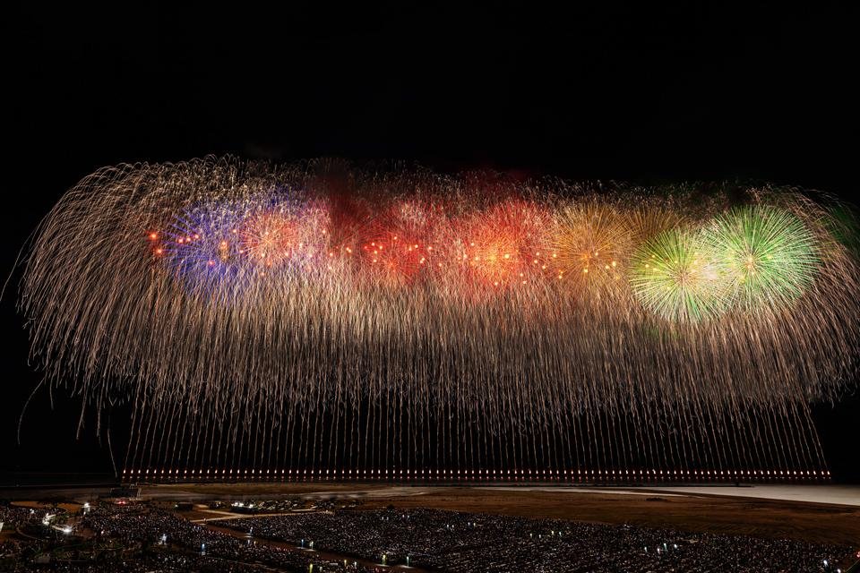 1つ目は、オープニングスターマインです。海の大花火大会ならでは、日本海に沈むきれいな夕日と、紺碧の空をバックにしたスターマインからスタートします。自然が生み出す色合いと、花火職人が作り出す火の色が重なり合って、空に美しいグラデーションが広がります。海・空・花火がひとつに溶け合うような、ここならではの景色がおすすめです。