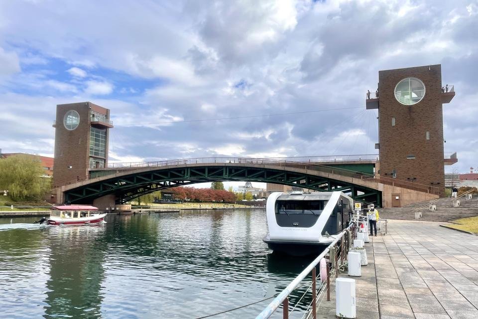 公園を流れる運河は、かつて北前船交易で栄えた富山市北部の岩瀬エリアとつながっており、運河クルーズ「富岩水上ライン」で岩瀬エリアまで遊びに行くこともできます。約1時間の船旅では、公園の雄大な景観に癒され、「中島閘門」の水上エレベーターにワクワクしながら、クルーズならではの爽快な旅を楽しめます。