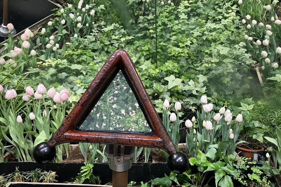 館内の見どころのひとつが「パレットガーデン」。5,000本ものチューリップが並ぶ空間は、壁一面の鏡に映り込み、まるで万華鏡のよう。視線を動かすたびに色とりどりの花が広がり、思わず立ち止まって見入ってしまう不思議な体験ができます。チューリップを映すことだけを考えて作られた万華鏡は、フォトジェニックな写真を撮るのにぴったりです。