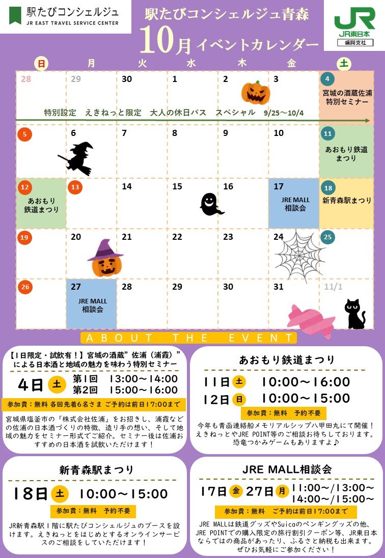 また、10月11日(土)と12日(日)は青函連絡船メモリアルシップ八甲田丸で「あおもり鉄道まつり」に、10月18日(土)は新青森駅で「新青森駅まつり」に駅たびコンシェルジュのブースを設けます。えきねっと等オンラインサービスのご相談が可能です!