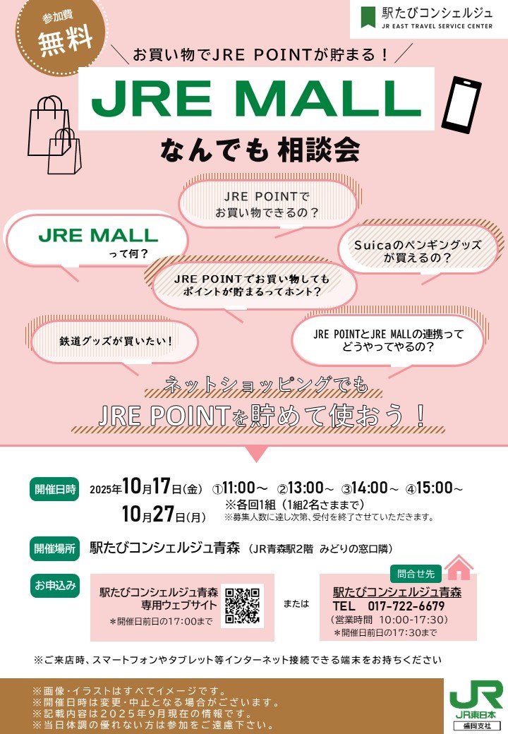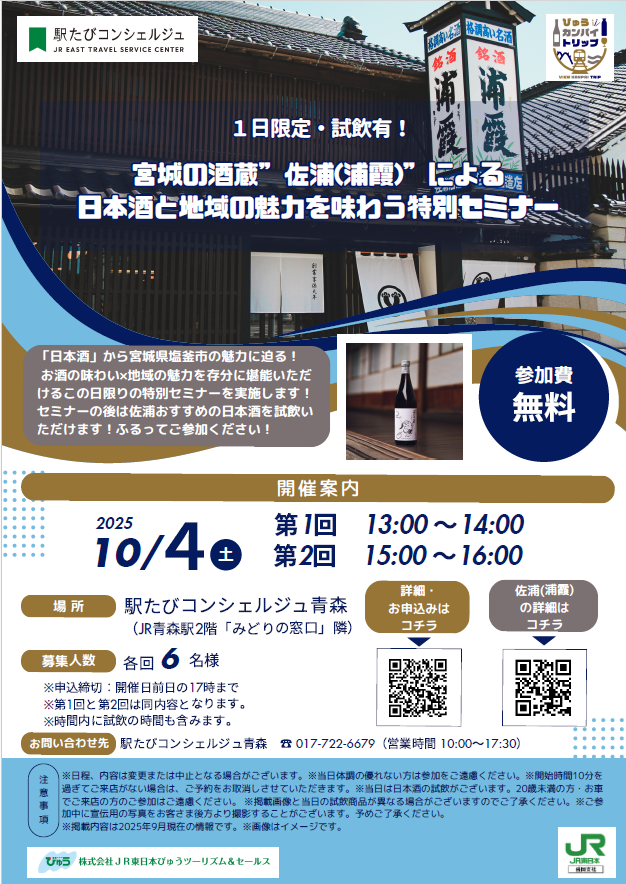 今月の注目イベントは、10月4日(土)の「宮城の酒蔵"佐浦(浦霞)"による日本酒と地域の魅力を味わう特別セミナー」と10月17日(金)、27日(月)の「JRE MALLなんでも相談会」です!ぜひお気軽にご参加ください。