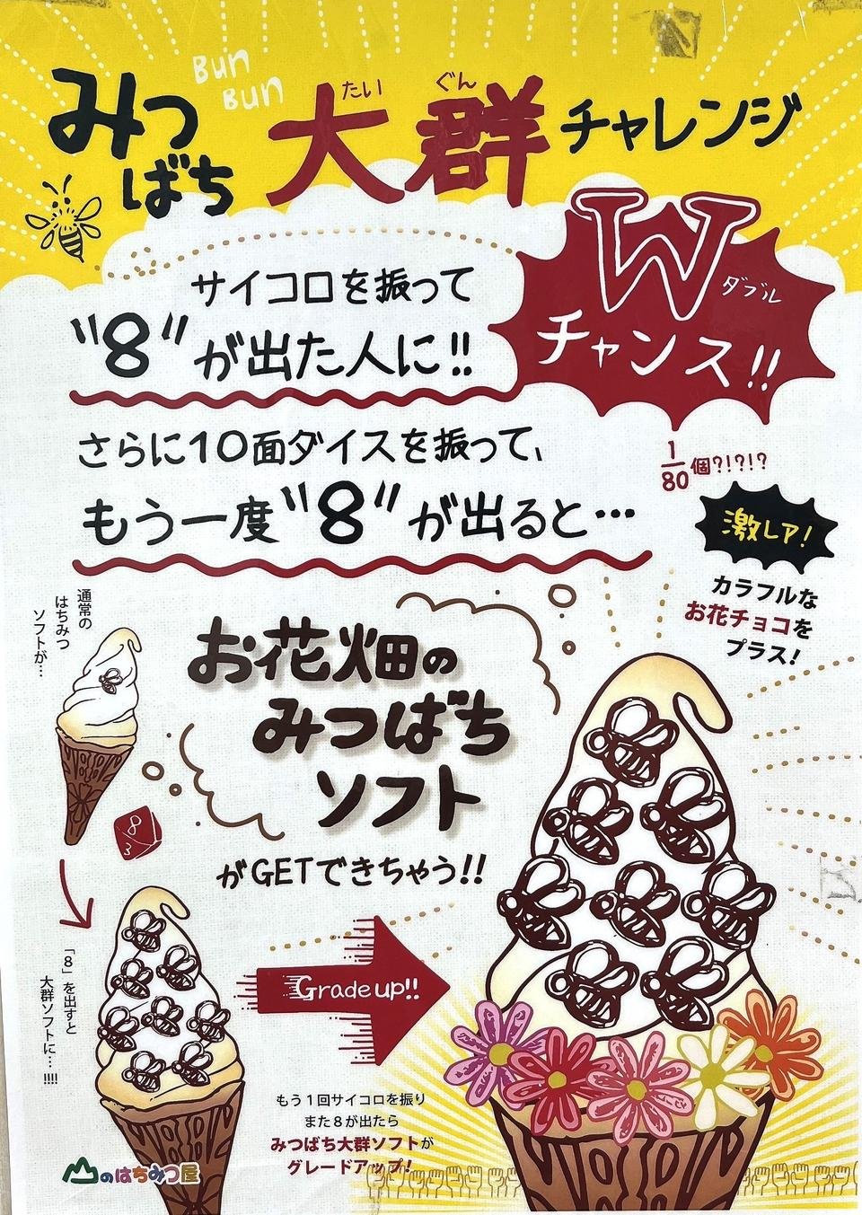 はちみつソフトを購入した方はもれなく「みつばち大群チャレンジ」に参加ができます。サイコロを振って8が出ると、みつばちチョコを8個乗せてくれます。