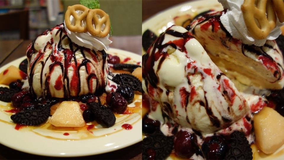 かなりのボリュームで(全体の直径約11㎝、高さは約18㎝)全容は見えませんが、パンケーキは底に4枚!プリンはアイスと生クリームの中に隠れています。アイス以外のフルーツもひんやり。「これはなんのご褒美?!」と自問してしまうほど、そして周りのお客さまも思わず「中はどんな?」と声をかけてくれるほどのインパクトでした!