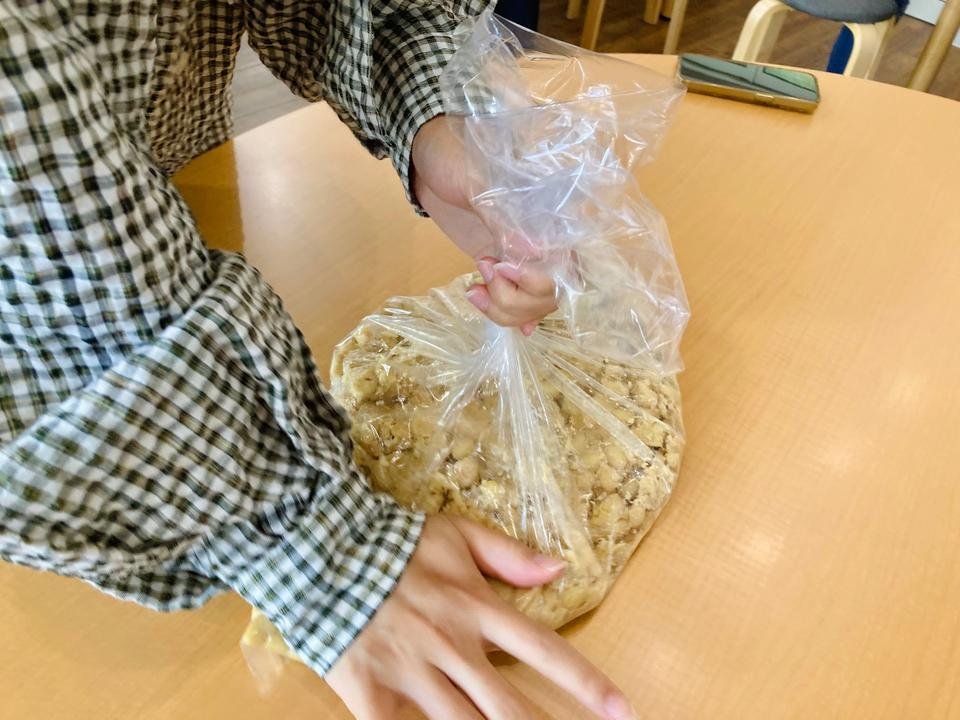 材料をすべて袋に入れて混ぜ込んでいきます。練りこむように手を動かしながら、大豆を潰していくように、5分くらい混ぜ込んだら、味見をしてみます!塩が全体に行き渡ってしょっぱい!と感じたらこれがOKのサインのようです。