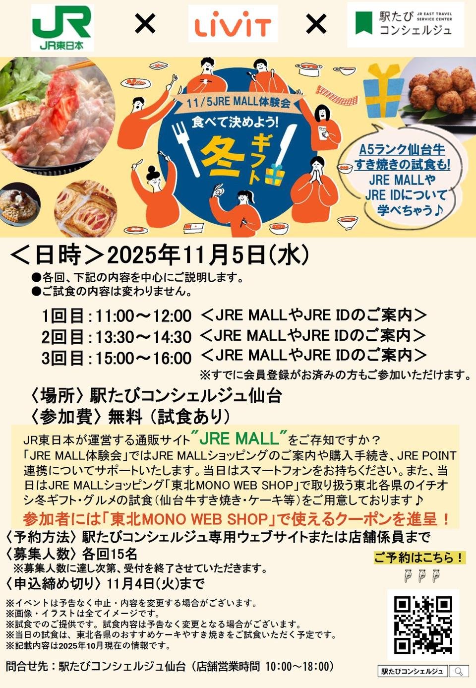また、当日はJRE MALLショッピング「東北MONO WEB SHOP」で取り扱う東北各県のイチオシ冬ギフト・グルメの試食(仙台牛すき焼き・ケーキ等)をご用意しております♪