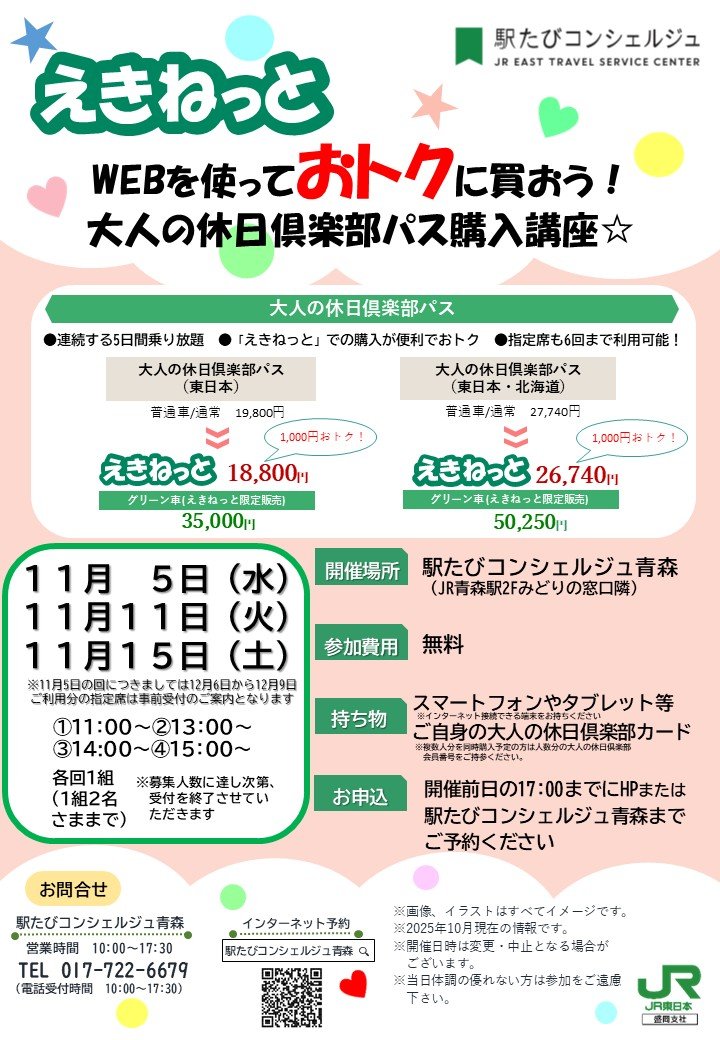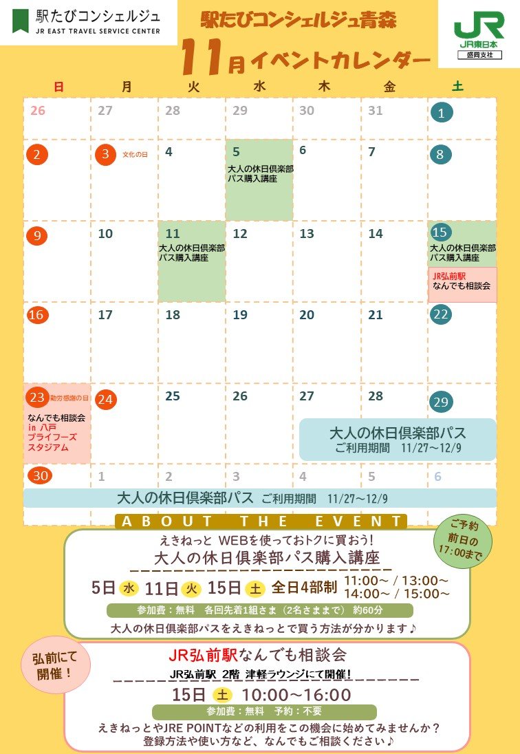 今月の注目イベントは、11月5日(水)、11日(火)、15日(土)にえきねっとで大人の休日倶楽部パスを購入する方法が分かる「WEBを使っておトクに買おう!大人の休日俱楽部パス購入講座☆」です!ぜひお気軽にご参加ください。