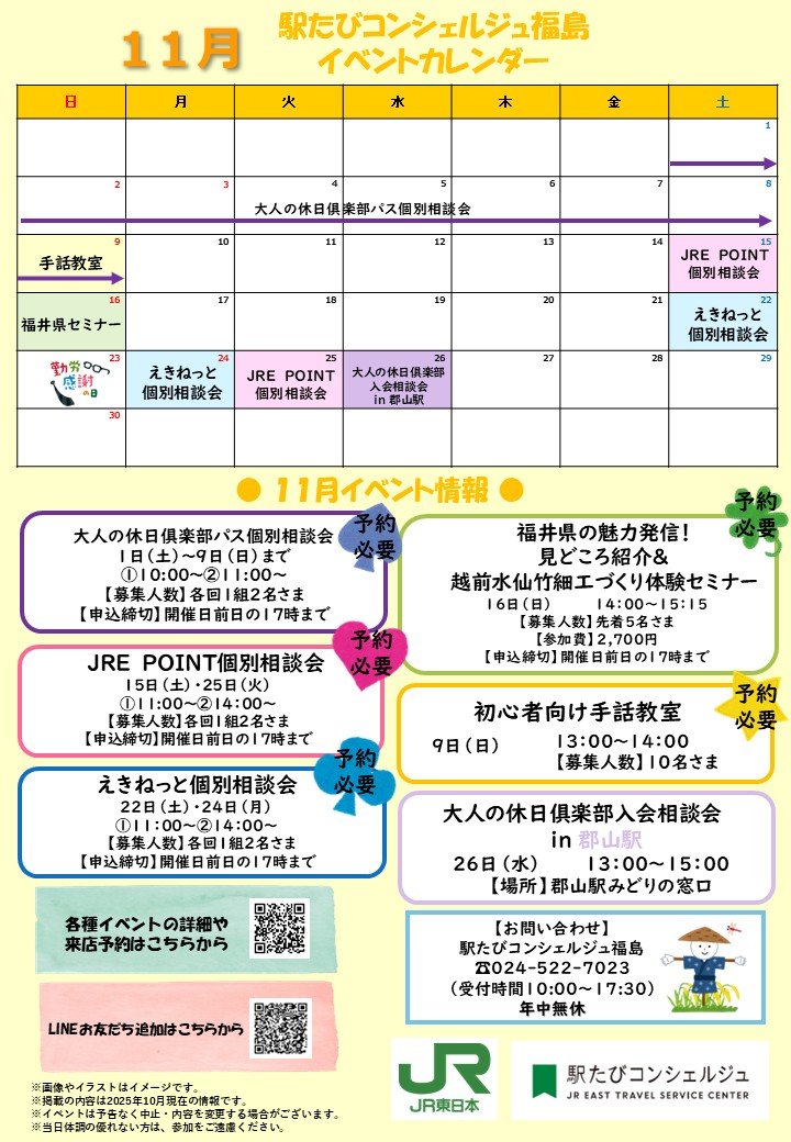 「駅たびコンシェルジュ福島」では、大人の休日倶楽部会員のお客さまや訪日旅行のお客さまへのご案内を中心に東日本エリアの観光情報発信及び各種ご旅行相談、JR東日本びゅうダイナミックレールパック(国内ツアー)、えきねっとやモバイルSuica等のJR東日本のオンラインサービスのお申込等をサポートいたします。
