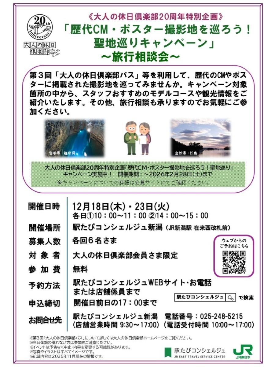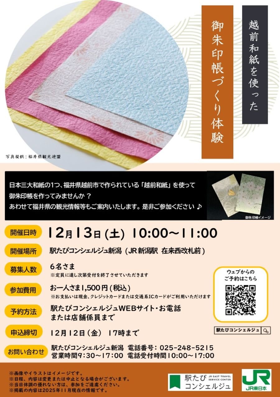 駅たびコンシェルジュ新潟では12月に越前和紙を使った御朱印帳づくり体験を行います。その他「大人の休日倶楽部」20周年を記念して「歴代CM・ポスター撮影地を巡ろう!聖地巡りキャンペーン」を実施しています。このキャンペーンに合わせ、スタッフおすすめの観光地などを紹介したり、第3回「大人の休日倶楽部パス」の旅行相談会を開催いたします。