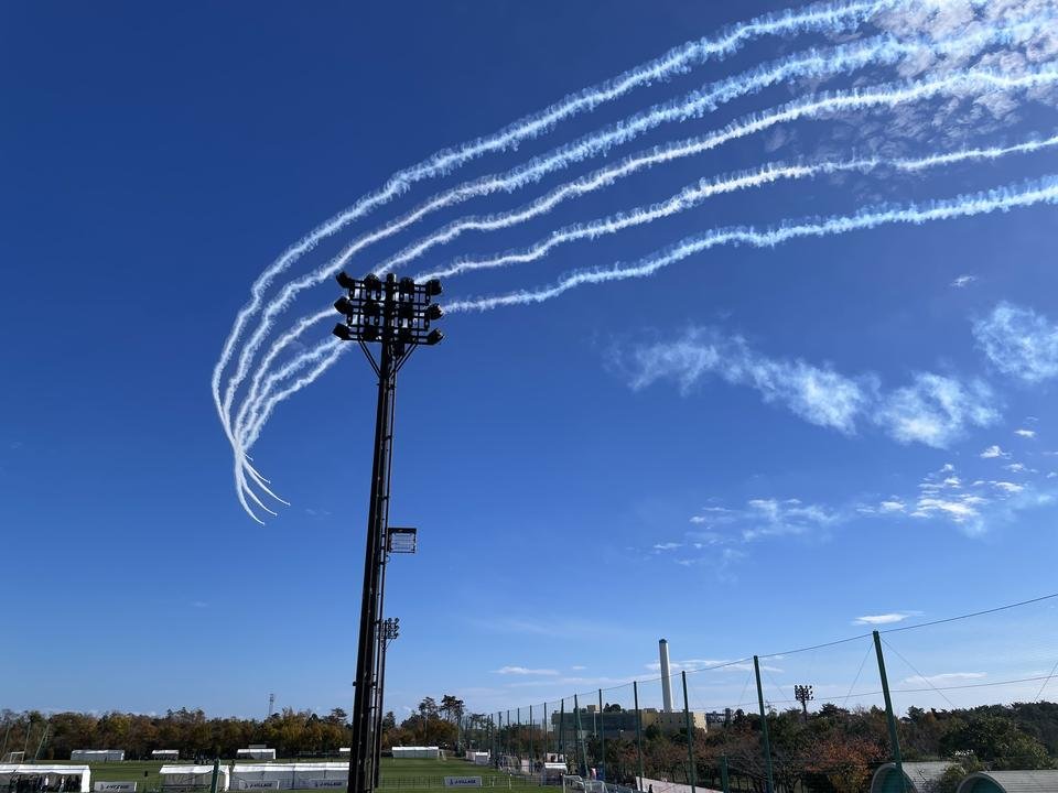 また今回のツアーでは、とてもラッキーなことに、楢葉町で開催された「東京2025デフリンピック(デフサッカー男女)」にあわせて、ブルーインパルスの展示飛行を鑑賞することができました。ピッチのグリーンと秋晴れのブルーの中を飛行するブルーインパルスの飛行はとても贅沢な時間でした。