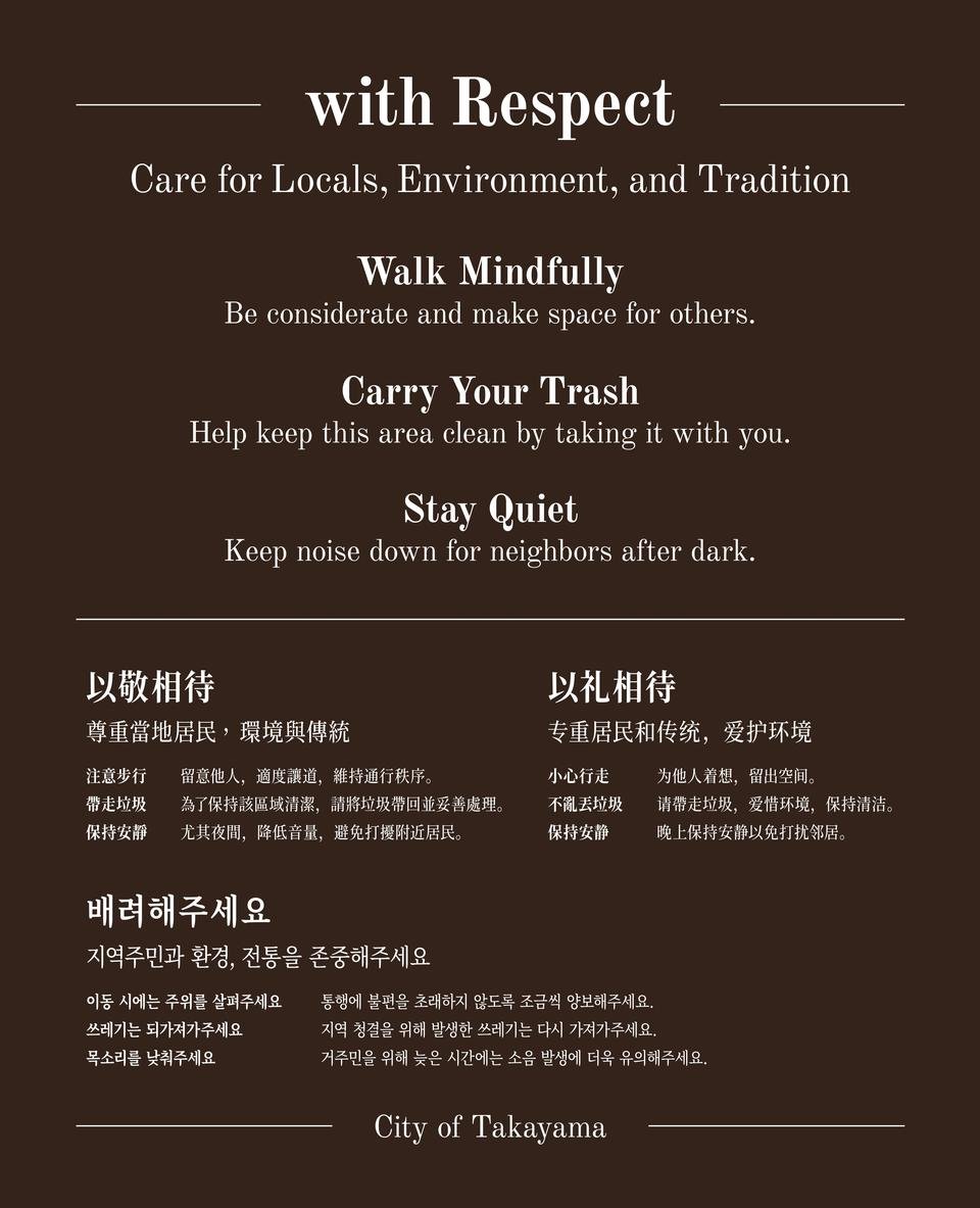 こうした中、高山市では観光客に対して住民生活や環境、伝統などを尊重して過ごしていただきたいという想いから、観光客へのマナー啓発のキャッチフレーズ「with Respect」を合言葉として、これから飛騨高山にとっての大切な言葉にしたいと考えています。