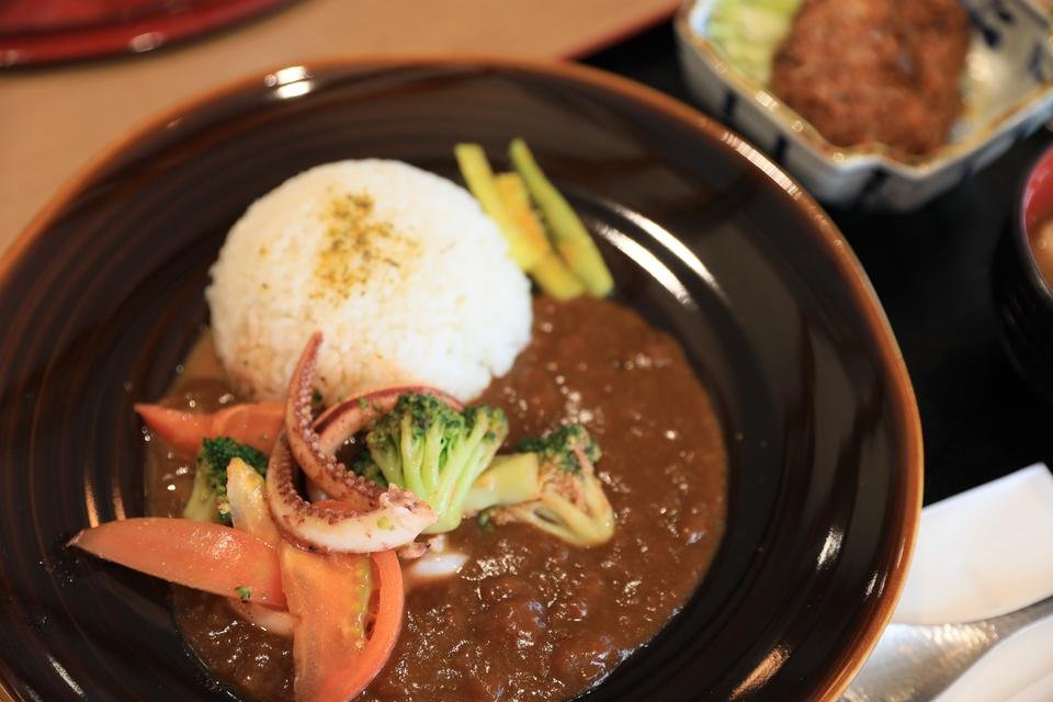 レストランでは、イカを使った料理を食べることができます。今回は「船凍イカ能登野菜天丼」と「イカすカレー」をいただきました。新鮮なイカなので、とにかくやわらかく、フワッとしたイカの食感が楽しめます。カフェでは、イカ墨を使った「イカスミソフトクリーム」もあるので、「イカの駅つくモール」を訪れた際はぜひ食べてみてください!