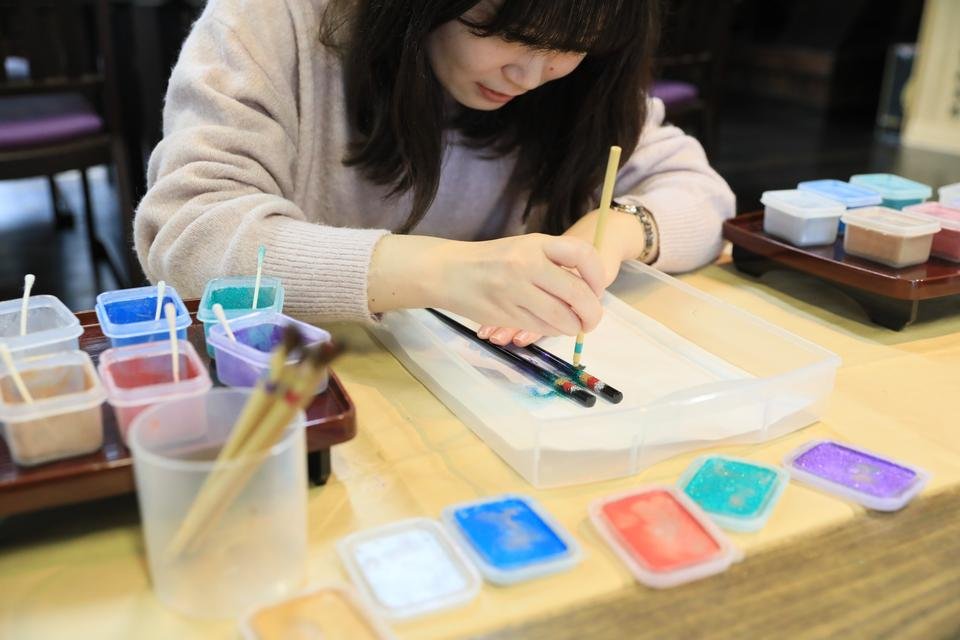 今回は「My箸づくり沈金体験(彩)」なので、カラフルなメタリックパウダーを使って色を付けていきます。6色の中から好きな色を選んで綿棒で箸に色をのせていきます。もちろん6色全部使ってもOK!パウダーは箸に付けた後、筆で落として模様に色がついているか確認していきます。最後はスタッフの方に仕上げをしていただいて完成です!色を付けている時よりも優しい色合いに仕上がりました!完成した箸は当日持ち帰ることができるので、輪島を訪れた時のお土産にいかがでしょうか。
