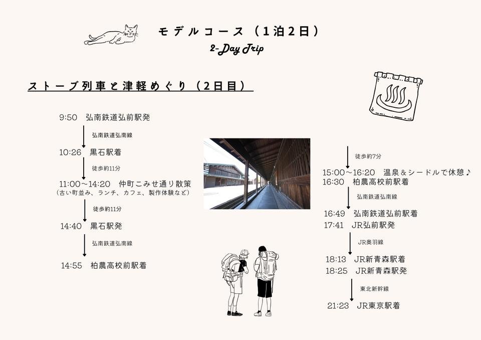 2日目は黒石駅から徒歩圏内の仲町こみせ通りの古い街並みを散策しながら、少し移動すると温泉やシードルの楽しめる場所で休憩もできますよ♪穴場な観光スポットをぜひお楽しみください。