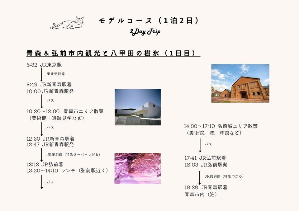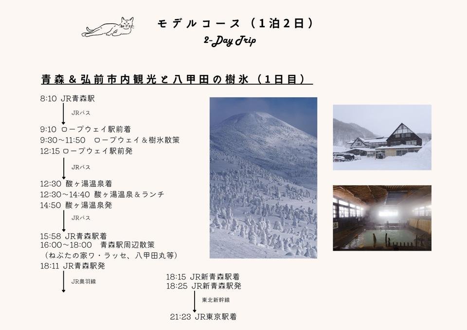 1日目は美術館を2つ巡れるくらいフリー時間も確保できるので、アップルパイを食べ比べたり、建築物をゆっくり見て周れます。2日目は2~3月が見頃となる八甲田の樹氷がメインとなっていて、温泉と合わせて楽しめる充実のコースになっています♪