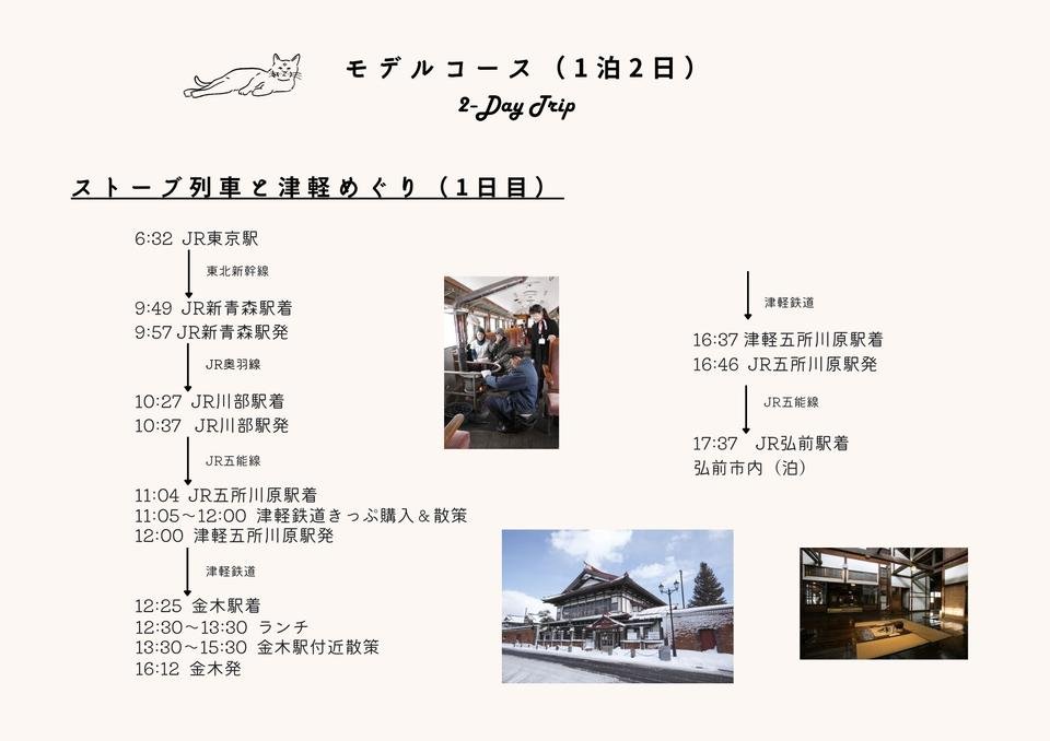1日目は津軽鉄道ストーブ列車での移動を楽しみながら、金木駅では歴史ある建築物や駅舎などを見て周れます。