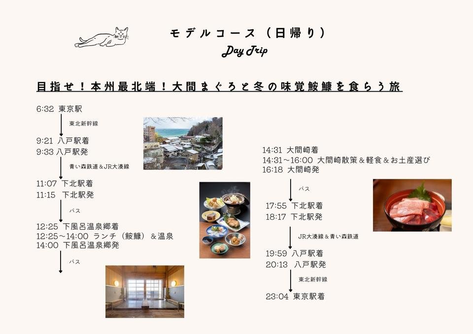 首都圏にお住まいの皆さまも日帰りが可能です!つまり、キュン♡パス1日間用=10,000円で下北・大間への充実した日帰り旅行が叶います♪