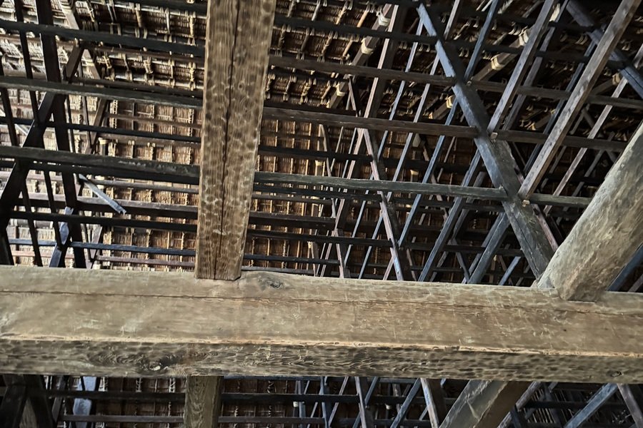江川邸の母屋に足を踏み入れると、まず目に飛び込んでくるのが約50坪にも及ぶ広大な土間空間。その天井を見上げると、まるで幾何学模様のように美しく組まれた「小屋組づくり」(こやぐみづくり)の屋根裏構造が広がっています。「小屋組づくり」は、釘を一切使わず木材同士を巧みに組み合わせる伝統工法で造られたもので、高い耐震性を備え、幾度となく襲った地震にも耐え抜き、江川邸の歴史を今日までしっかりと支えてきました。