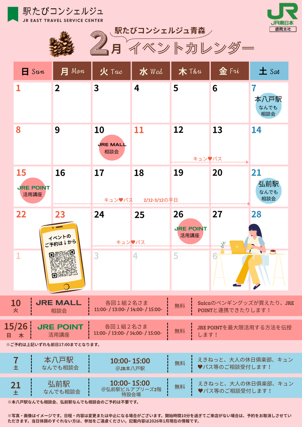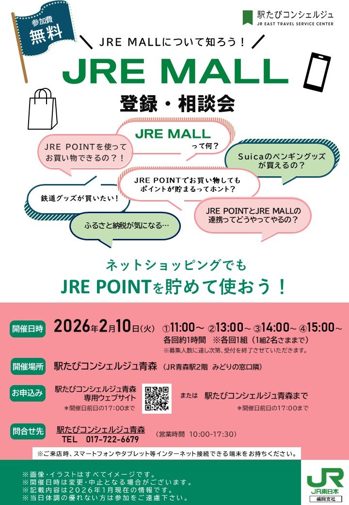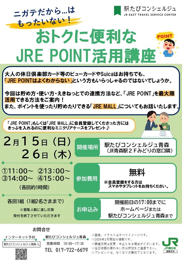 今月の注目イベントは、JRE POINTを最大限活用できる方法をご案内する2月15日、26日の「JRE POINT活用講座」です!また、2月7日にはJR本八戸駅で、2月21日にはJR弘前駅で「なんでも相談会」を開催します。