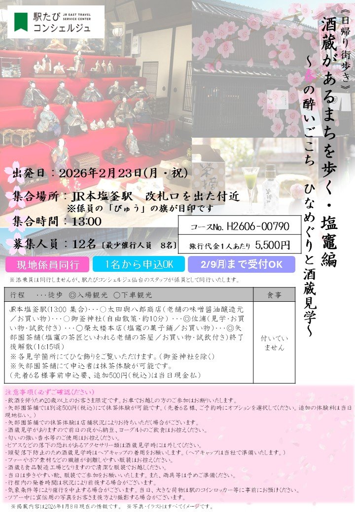 「酒蔵があるまちを歩く・塩竃編~春の酔いごこち ひなめぐりと酒蔵見学~」