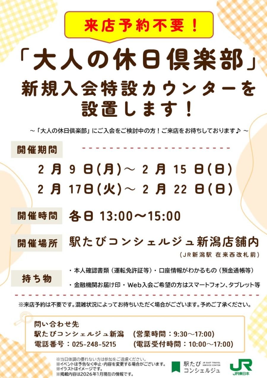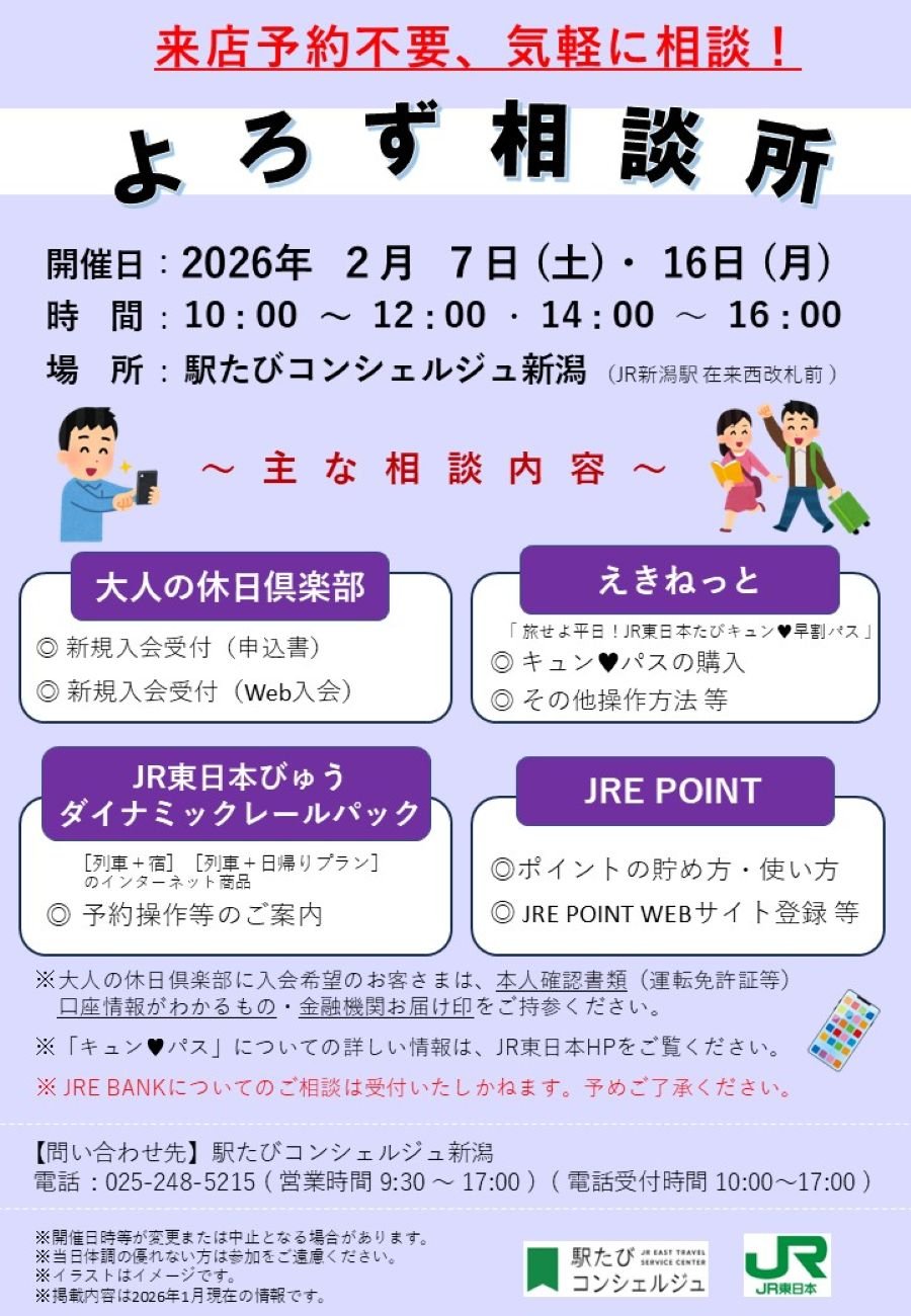 さて、駅たびコンシェルジュ新潟では2月に「よろず相談所」を開催します。また、期間限定で「大人の休日倶楽部 新規入会特設カウンター」を設置します!いずれも予約不要となっていますので、お友達同士はもちろん、お一人さまでもお気軽にご参加いただけます!皆さまのご来店、ご予約をスタッフ一同心よりお待ちしております。