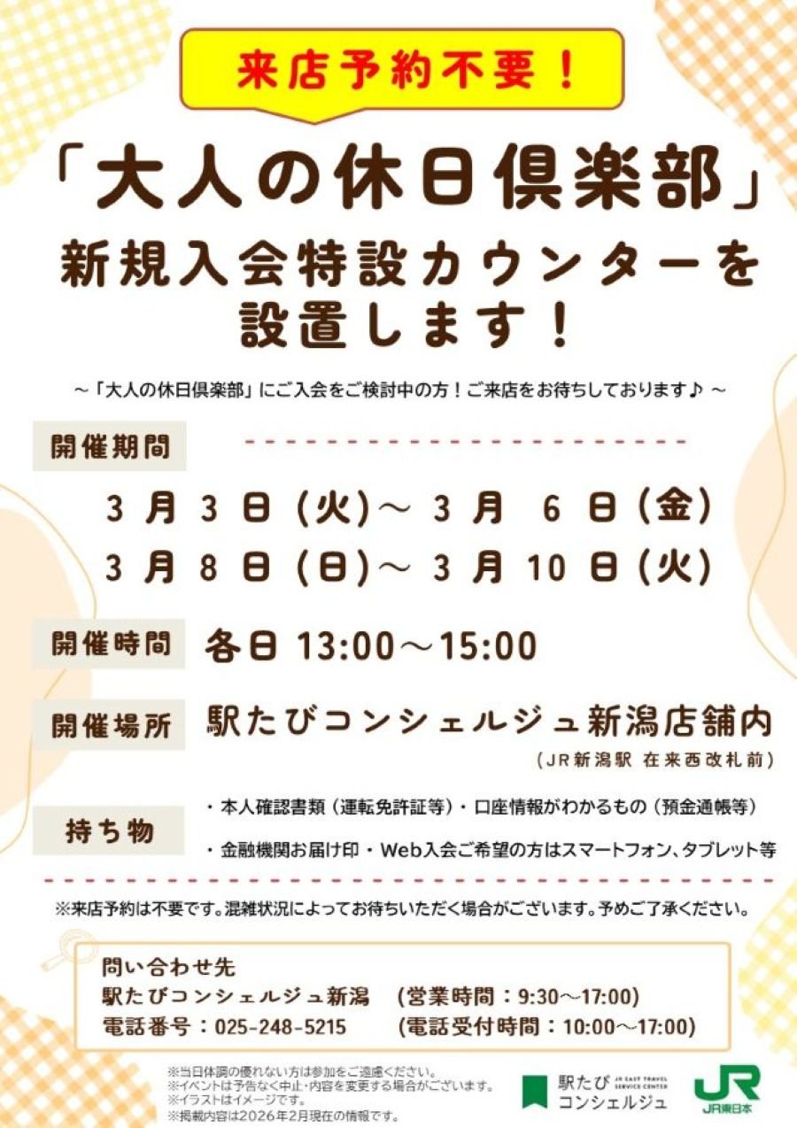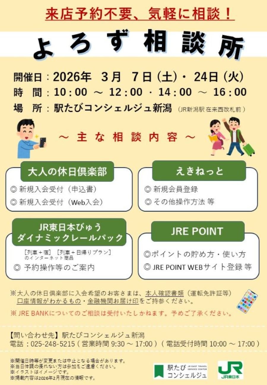さて、駅たびコンシェルジュ新潟では3月に「よろず相談所」を開催します。また、期間限定で「大人の休日倶楽部 新規入会特設カウンター」を設置します!いずれも予約不要となっていますので、お友達同士はもちろん、お一人さまでもお気軽にご参加いただけます!皆さまのご来店をスタッフ一同心よりお待ちしております。