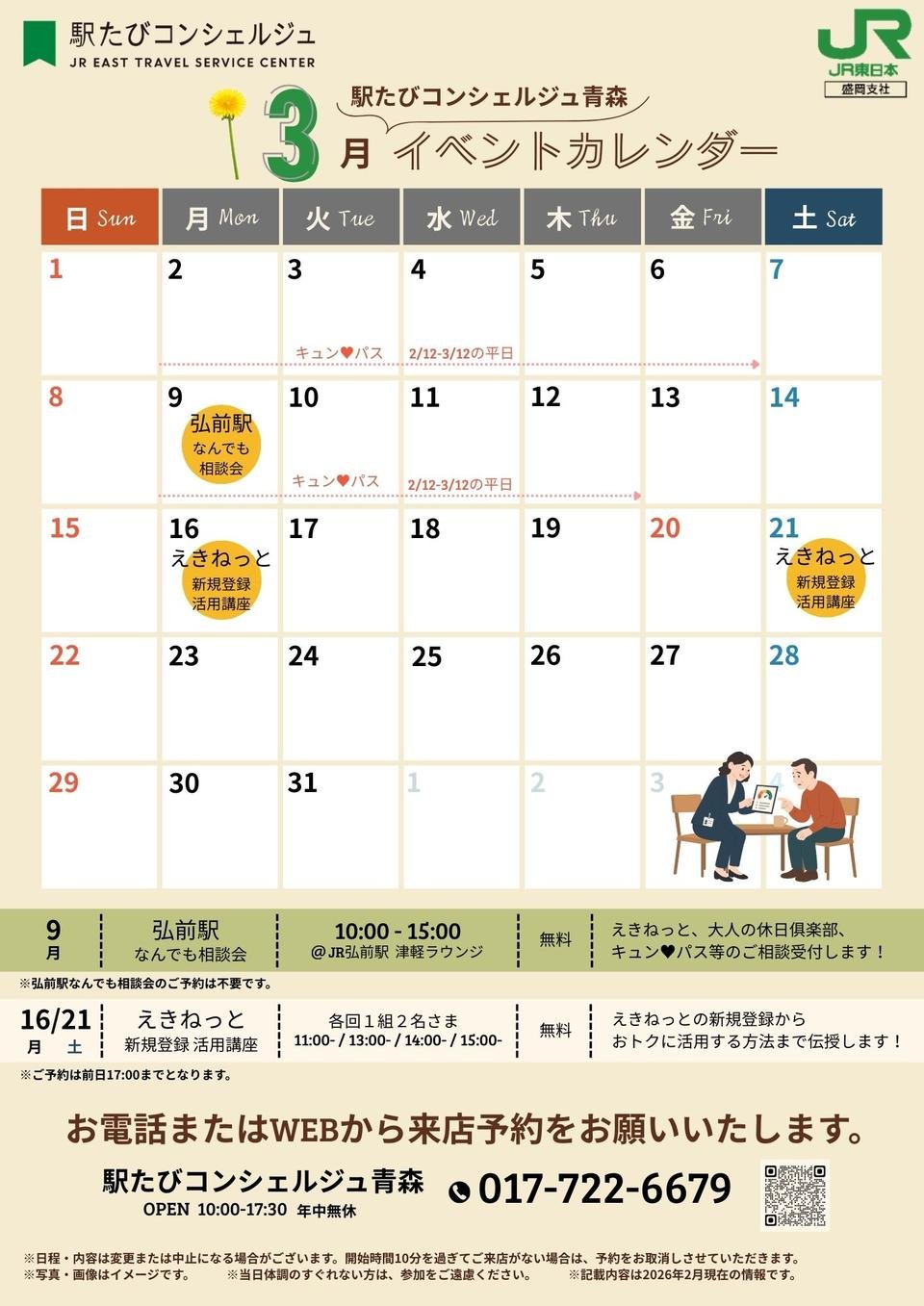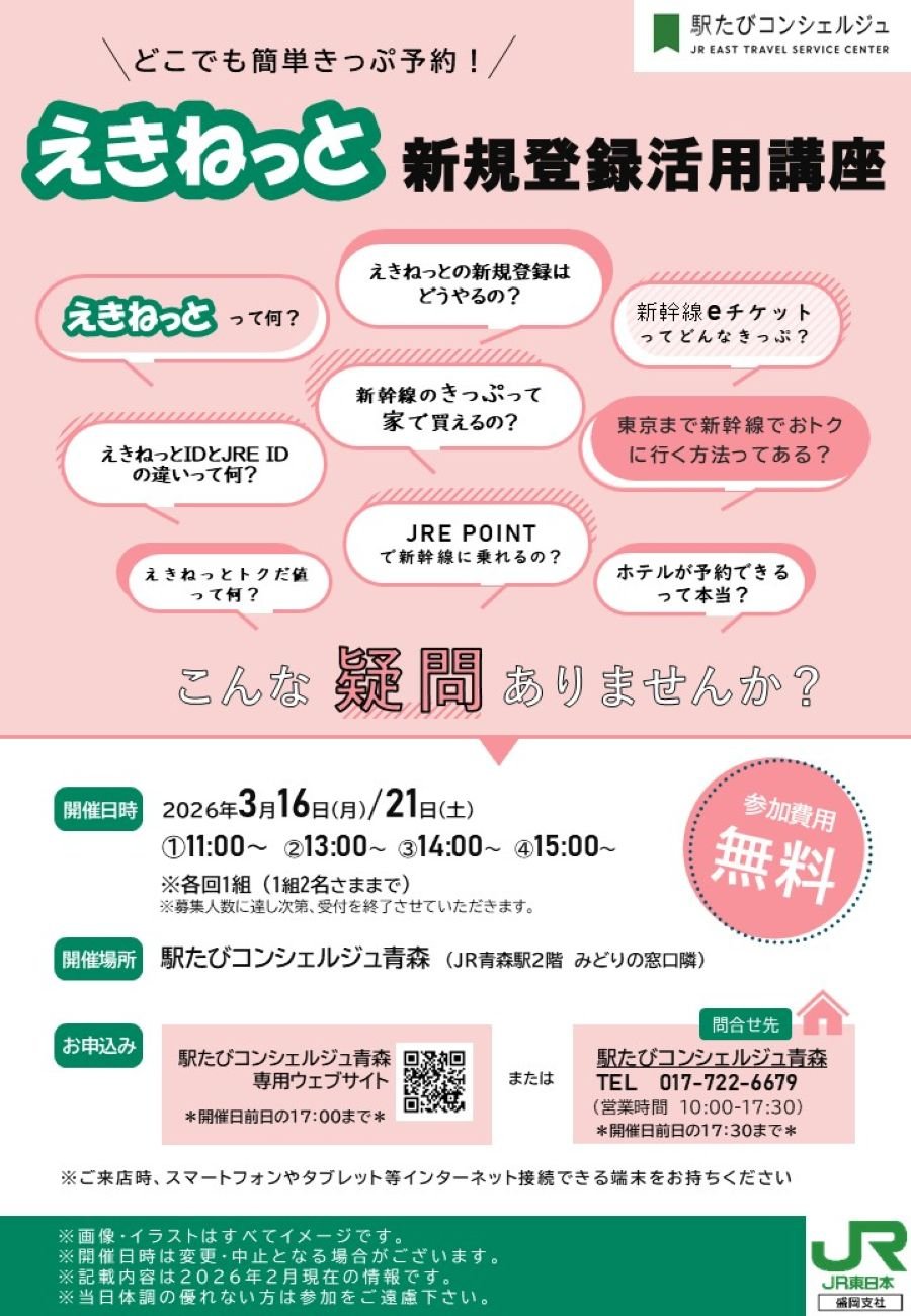 今月の注目イベントは、えきねっとの新規登録方法や操作方法をご案内する3月16日、21日の「えきねっと新規登録活用講座」です!また、3月9日にはJR弘前駅で「なんでも相談会」を開催します!