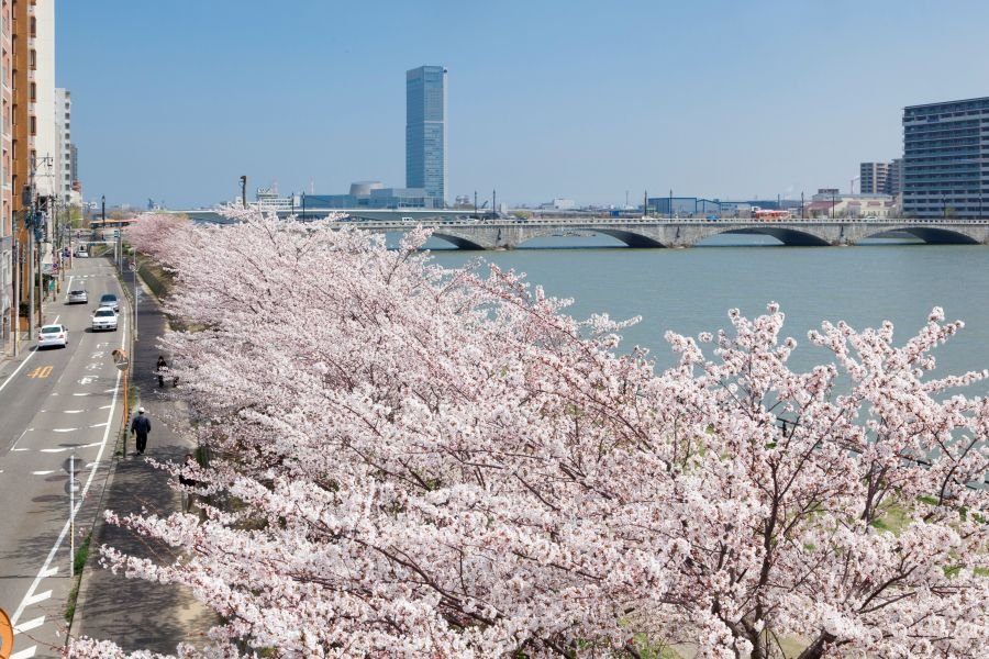 新潟県の中心部新潟市内には、いくつかの桜の名所があります。その中で、新潟駅からバスを利用してアクセスしやすい「信濃川やすらぎ提緑地」、春まつりと桜で賑わう「白山神社(白山公園)」、湖周辺に桜が咲き誇る「鳥屋野潟」をご紹介いたします。