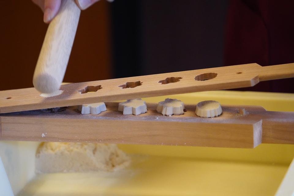 「気温や湿度はもちろん、粉に触れる手の温もりまでが影響する繊細な菓子なんですよ」。そんな伝統菓子の体験コースが人気。優雅で至福のひとときを楽しめます。