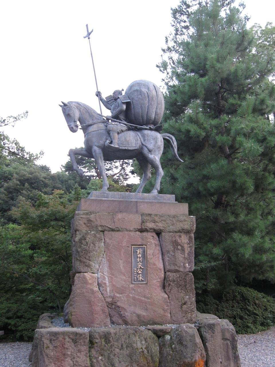 境内には長い槍を携え、矢を防ぐための母衣(ほろ)を背負った勇ましい利家の像も。傍らには内助の功で利家を支えた、まつの像も並びます。尾山神社の境内は通り抜けができ、奥に歩けば金沢城公園の鼠多門口にたどり着けます。