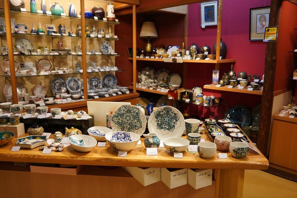 館内には九谷焼ショップと九谷焼で食事を楽しめる食事処を併設。庭園を見渡す食事処では定食のほかカフェメニューも楽しめます。