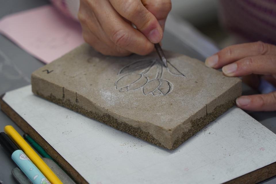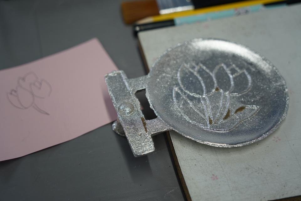 ショップ奥にある工房では鋳物づくりの体験ができ、ぐい呑みや風鈴、皿、箸置などを作ることができます。思い思いの絵柄を描き、その線にそって溝を彫り型に装着、錫(すず)をバーナーで溶かして型に流し込み固まったら完成です。自分だけのオリジナル鋳物に挑戦してください。