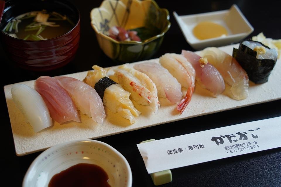 ここ、かたかごの店主は元々魚屋さんで働いており、魚を見る目はだれよりも確か。毎朝自ら市場に出向き、その日の魚の状態を吟味してから仕入れています。寿司をはじめ刺身や焼き物などメニューも多彩。人気は富山湾から水揚げされる旬の地魚にこだわった「富山湾鮨」。旬のにぎり10貫と富山らしい汁物付き。季節ごとにネタが異なるため、何度来ても飽きないためリピーターが多い店です。