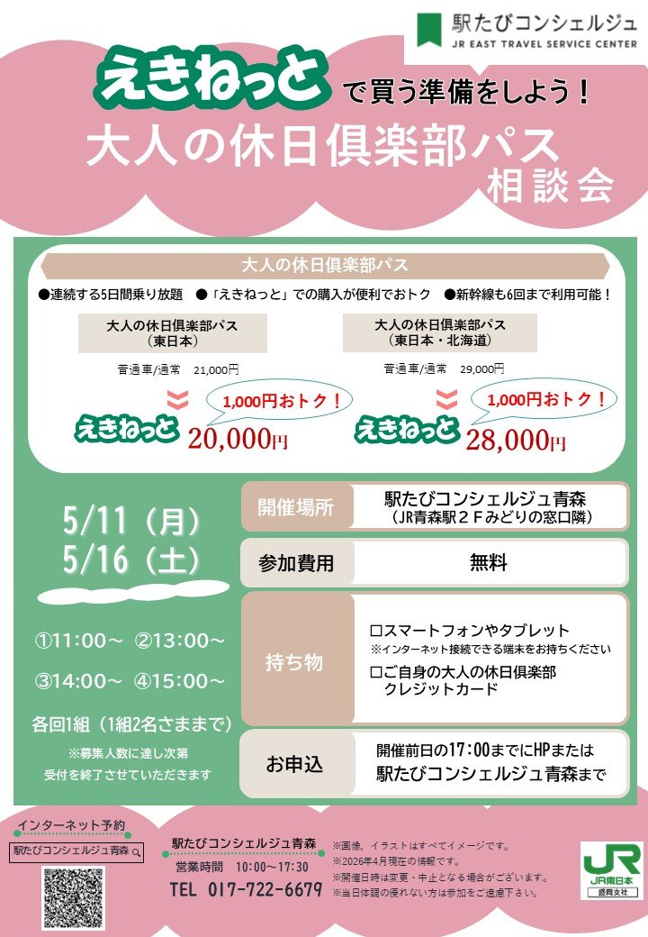 今月の注目イベントは、5月11日(月)、16日(土)開催の「えきねっとで買う準備をしよう!大人の休日倶楽部パス相談会」です。えきねっとから大人の休日倶楽部パスを購入すると1000円おトク!でも登録や操作に不安が…という方にオススメです♪