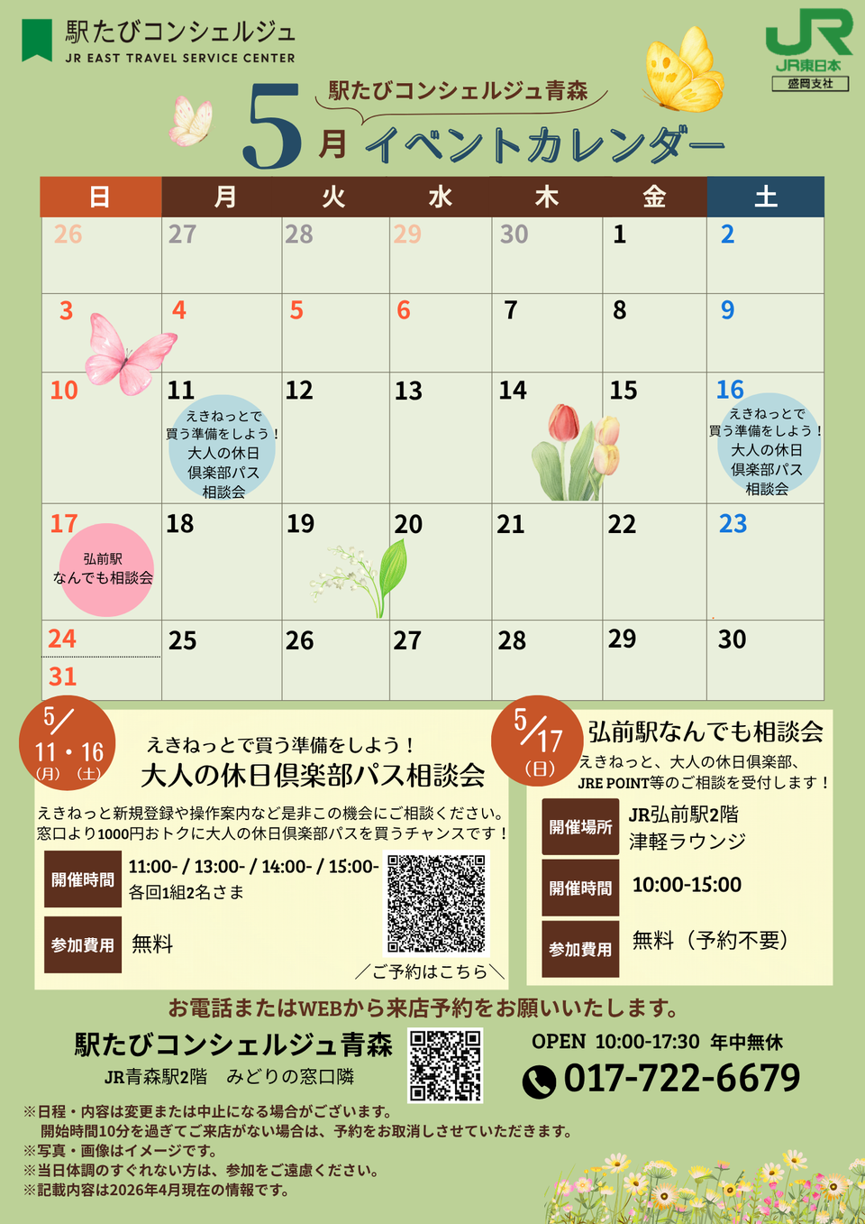 5月17日(日)にはJR弘前駅にて、「なんでも相談会」も開催いたします!えきねっとやモバイルSuicaなどの疑問があれば是非お越しください!